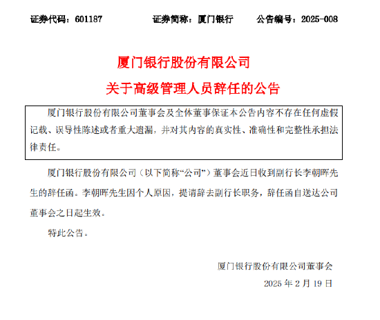 2月19日金融一线消息,厦门银行今日公告称,公司董事会近日收到副行长李朝晖的辞任函。李朝晖因个人原因提请辞去副行长职务,辞任函自送达公司董事会之日起生效。